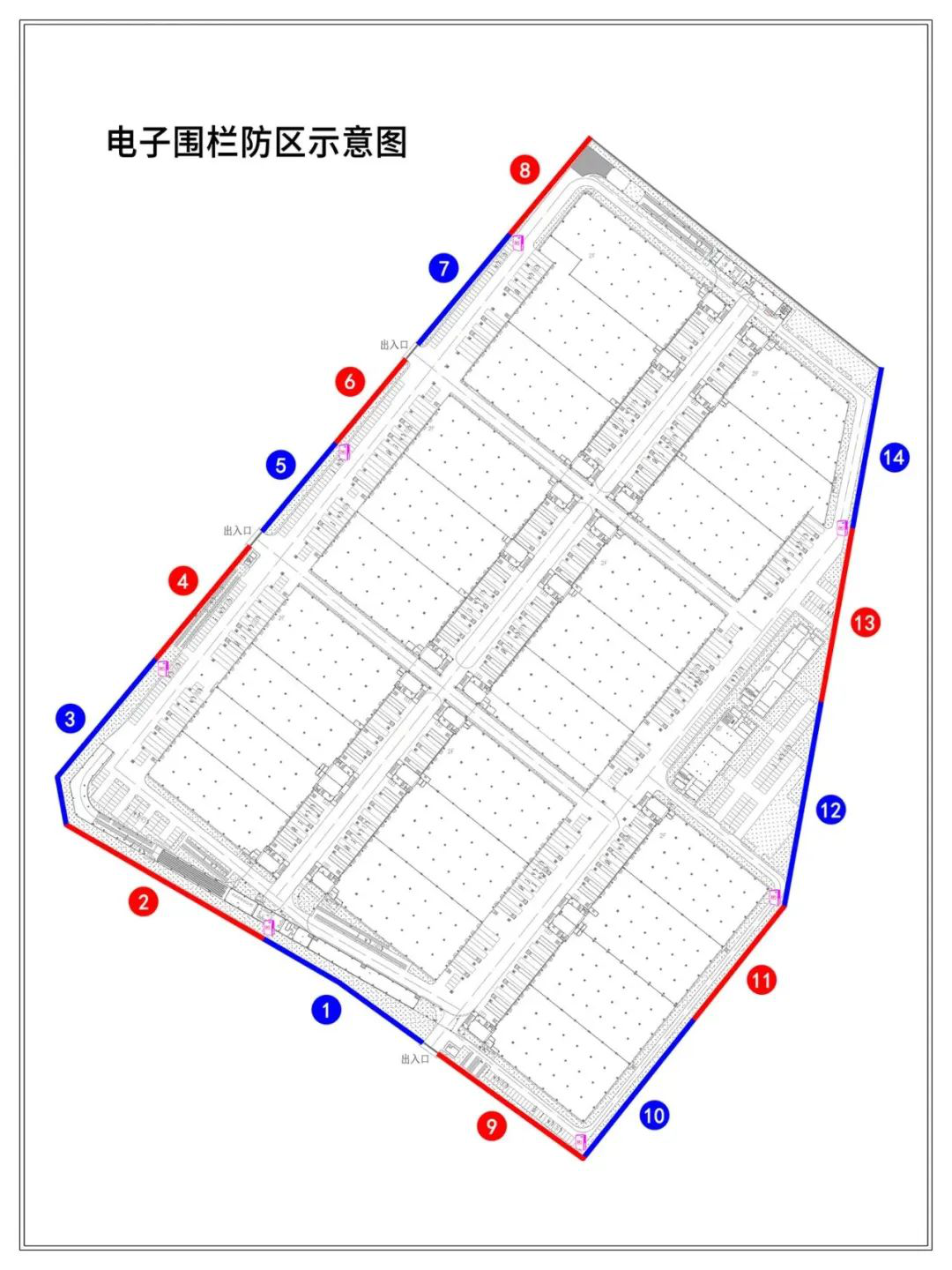 3、按照脈沖圍欄國(guó)家標(biāo)準(zhǔn)GB7946-2015規(guī)定單個(gè)防區(qū)不能超過100米,項(xiàng)目上我們?cè)O(shè)計(jì)為14個(gè)防區(qū)。