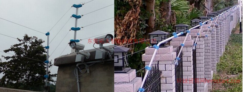 獨立式電子圍欄,直接架設在地面上。其高度約2米左右,一般安裝10-12根線纜??紤]到設備和人身安全,要求在獨立式電子圍欄的一側或兩側,安裝不低于1.2m的防護墻或圍墻。其間的凈空距離應不小于1m。使獨立式電子圍欄正常工作部位處于一個公眾通常難以接近的封閉區(qū)域內。